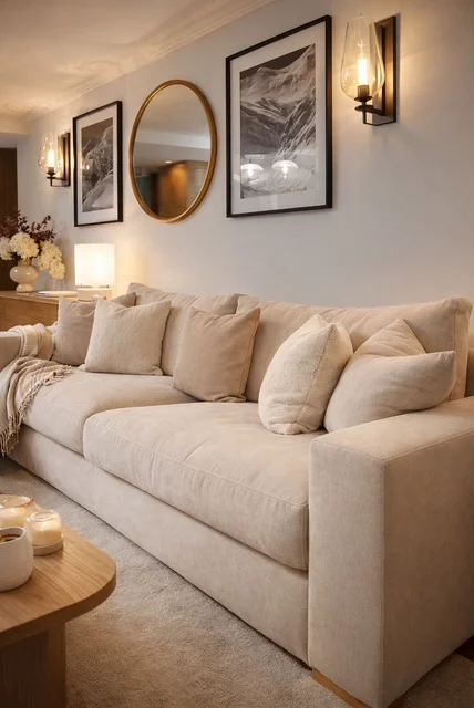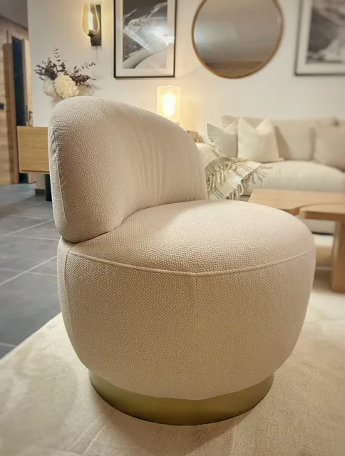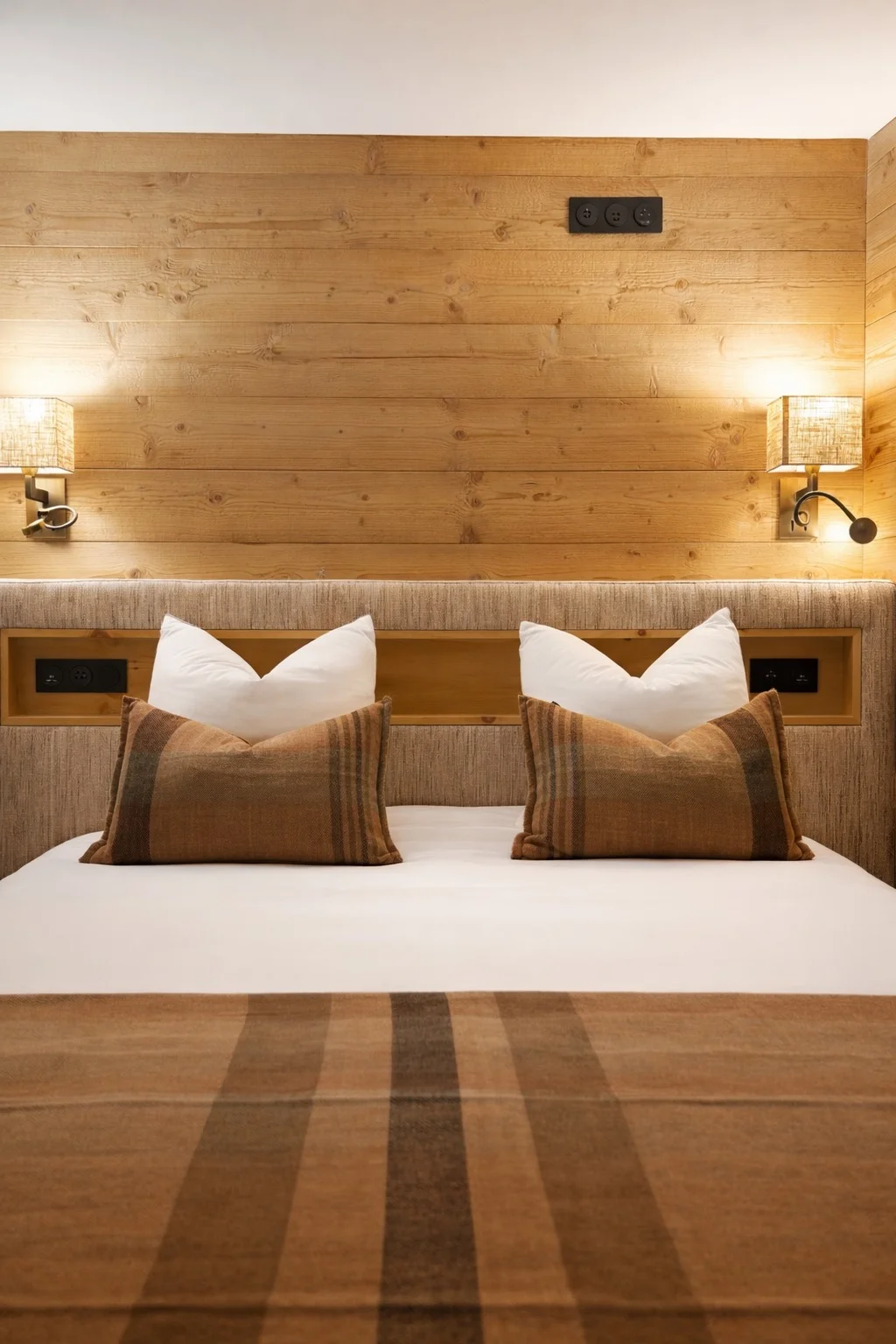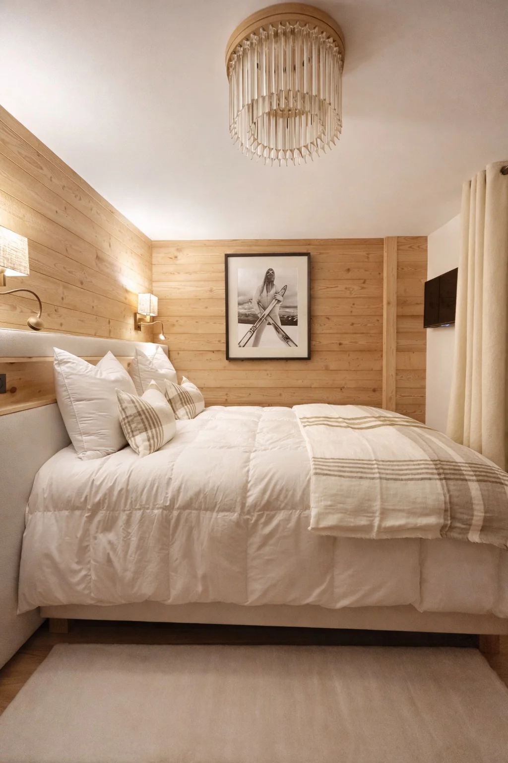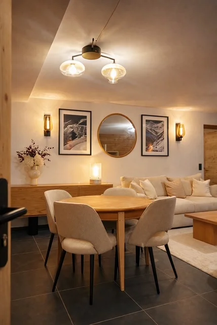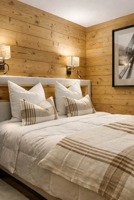 L’ambiance générale repose sur une palette douce et naturelle, mêlant bois, teintes chaleureuses et matières texturées, en parfaite adéquation avec l’univers montagne.
